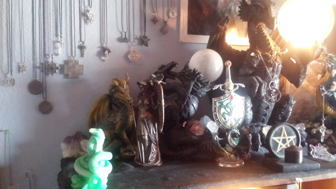 A This is a close up of some of the statues on the top of the shrine, left side, in addition to a few of my old pendants, you'll note a statue of Athena and Quetzalcoatl, off scene on the right there is a statue of Odin. The centerpiece dragon lamp has a copy of the dragon zodiac pendant I never take off, as well as the original dragon claw necklace that first triggered my otherkin awakening when I was eight or so. (painstakenly restored) I wear a matching claw beneath my shirt so at any given time me and that centerpiece are wearing the same two necklaces, it's what links me to the shrine.